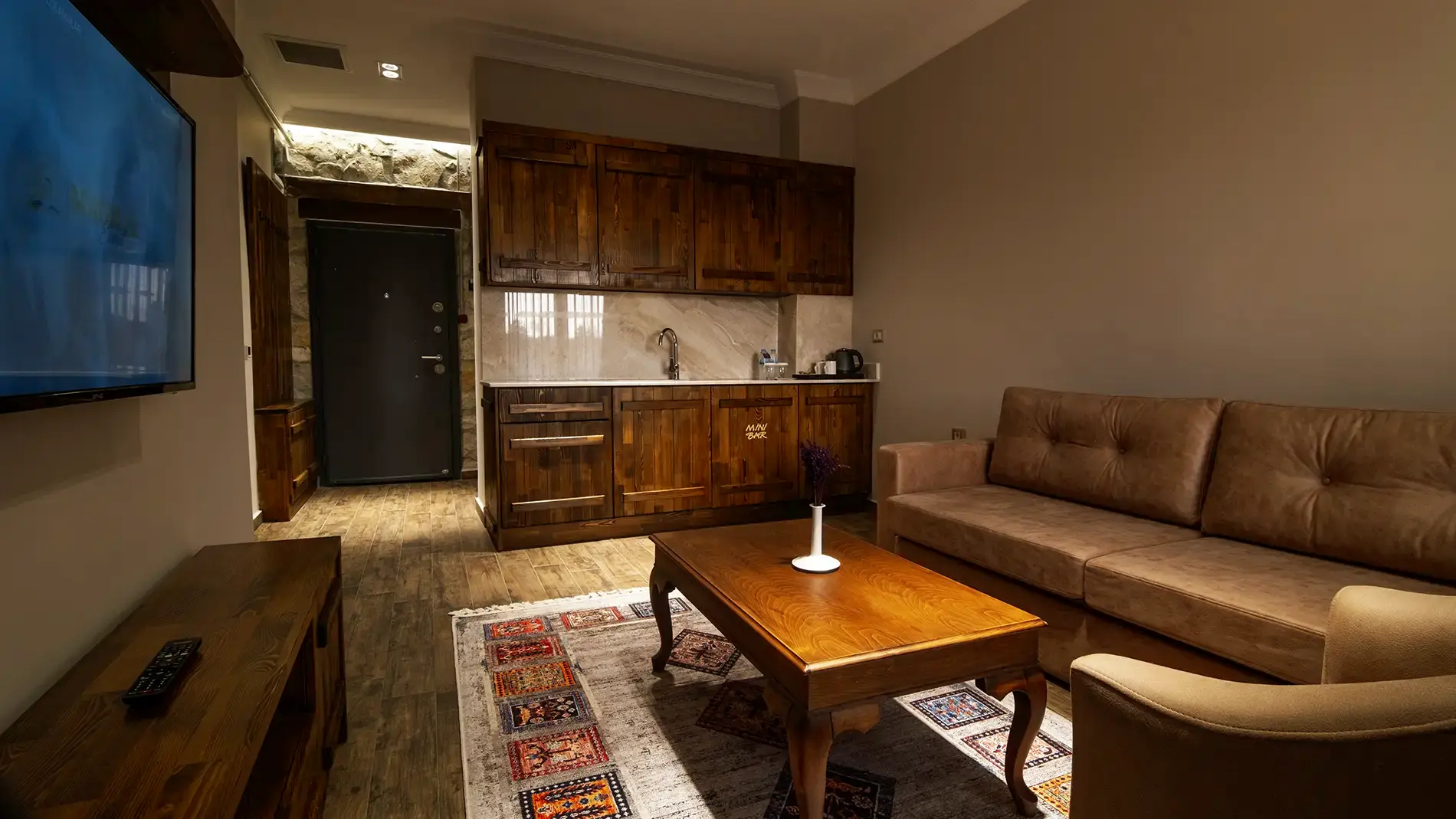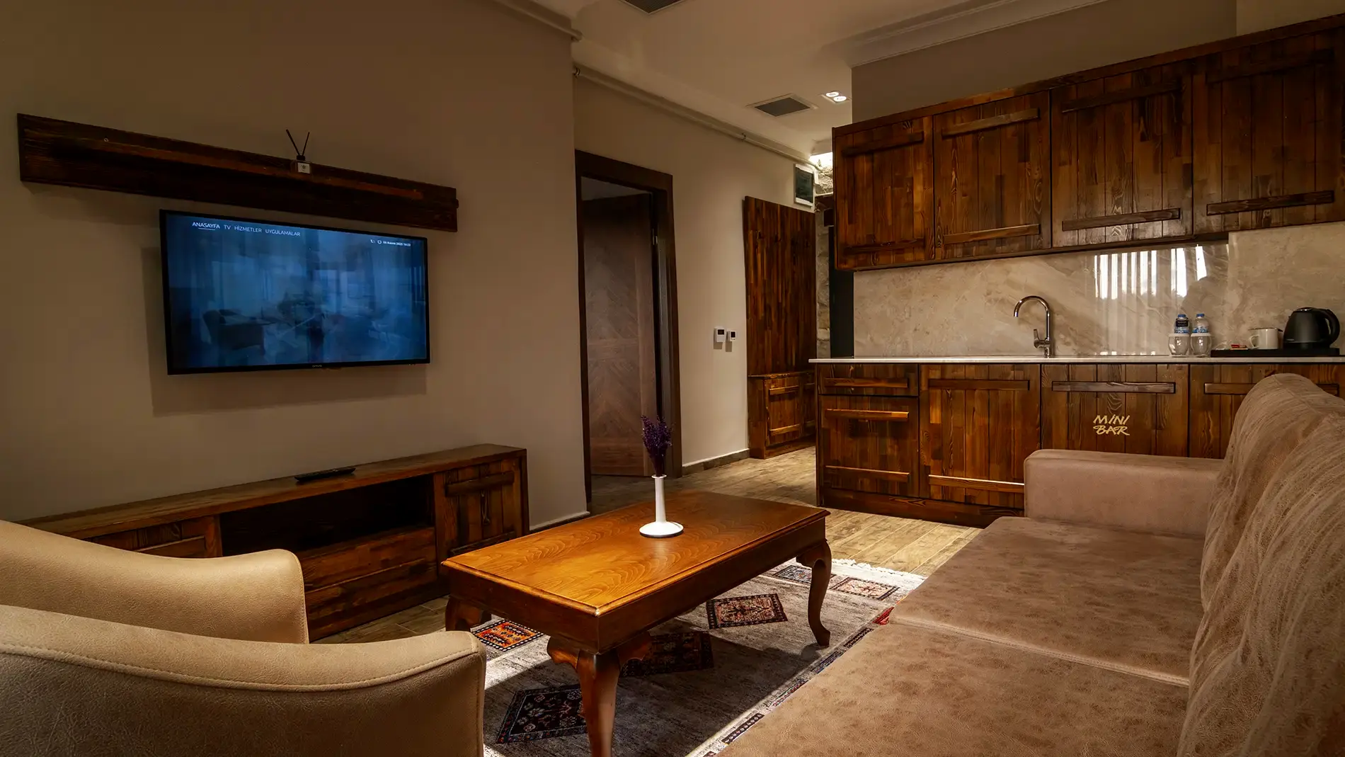 Deluxe odamızın sunduğu manzara, doğanın dinginliğini ve ferahlığını doğrudan odanıza taşıyor. Yatak odası doğaya açılırken, oturma alanı açık hava koridoruna bakar ve misafirlere adeta bir dağ evinde uyanıyormuş hissi yaşatır.