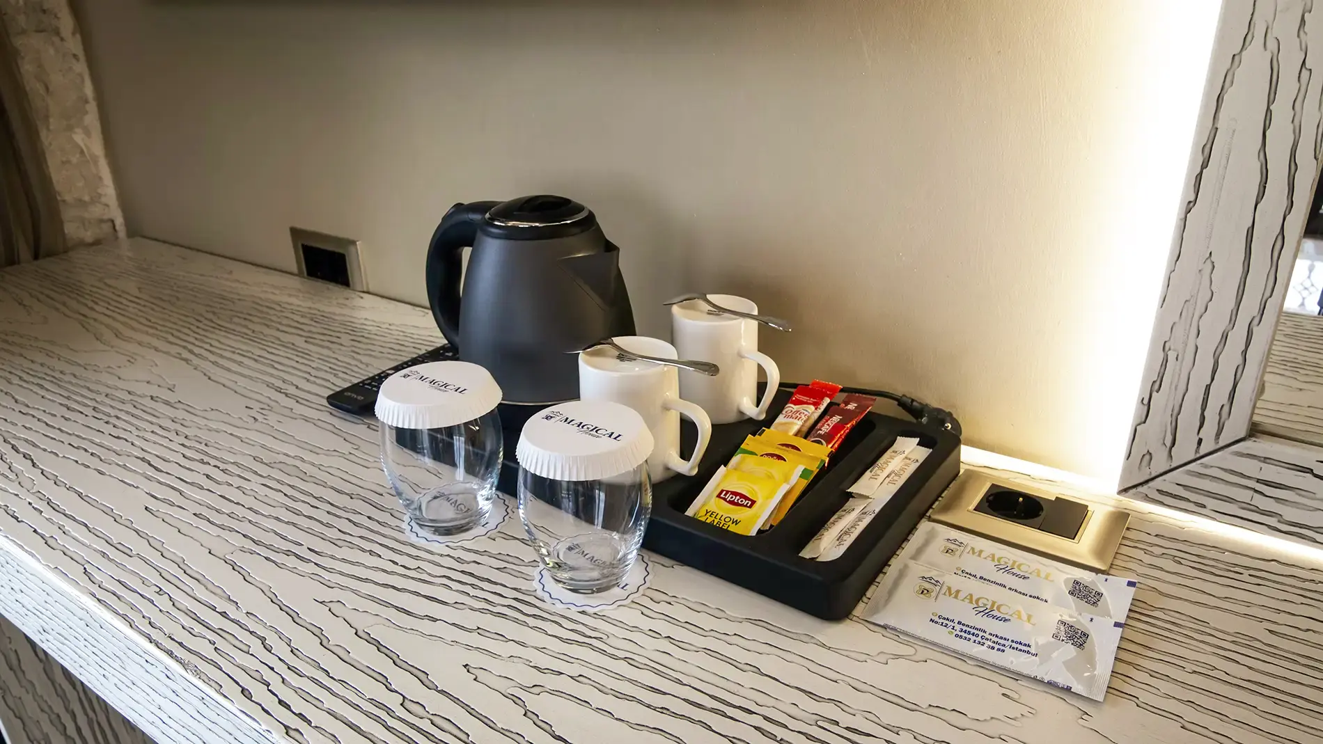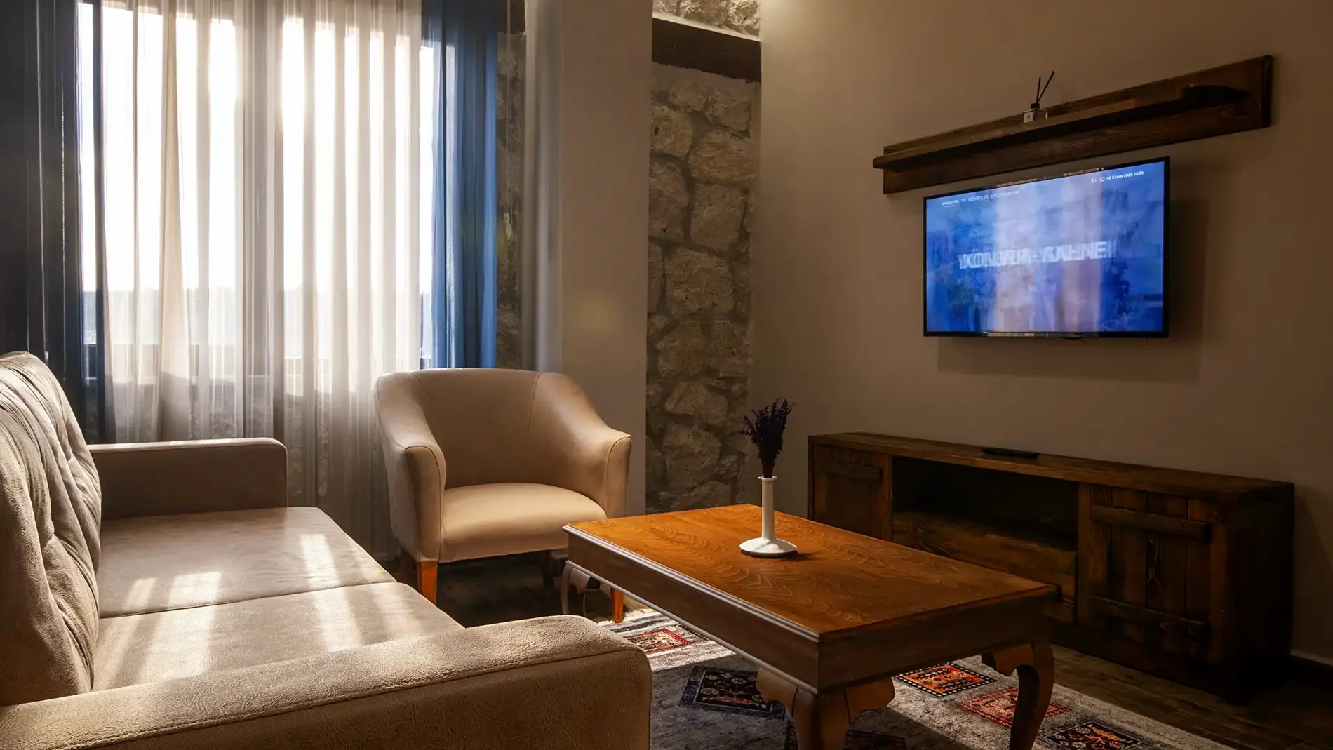 Geniş pencerelerden içeri süzülen gün ışığı, taş ve ahşap detaylarla bütünleşerek doğal bir atmosfer oluşturur. Sabahları kuş sesleriyle uyanmak ve akşamları sessiz bir doğa eşliğinde dinlenmek, Deluxe odanın sunduğu ayrıcalıklardan sadece birkaçıdır.