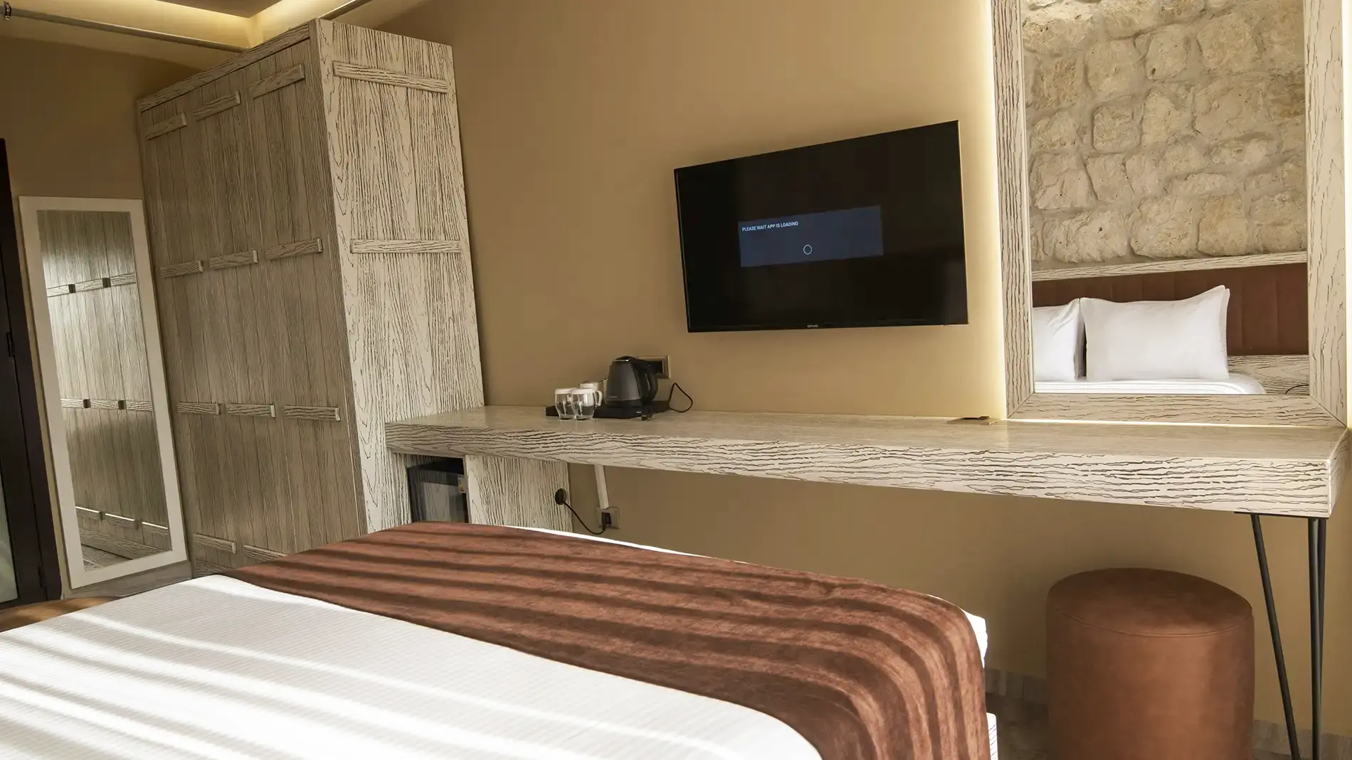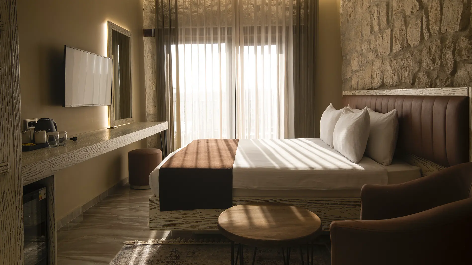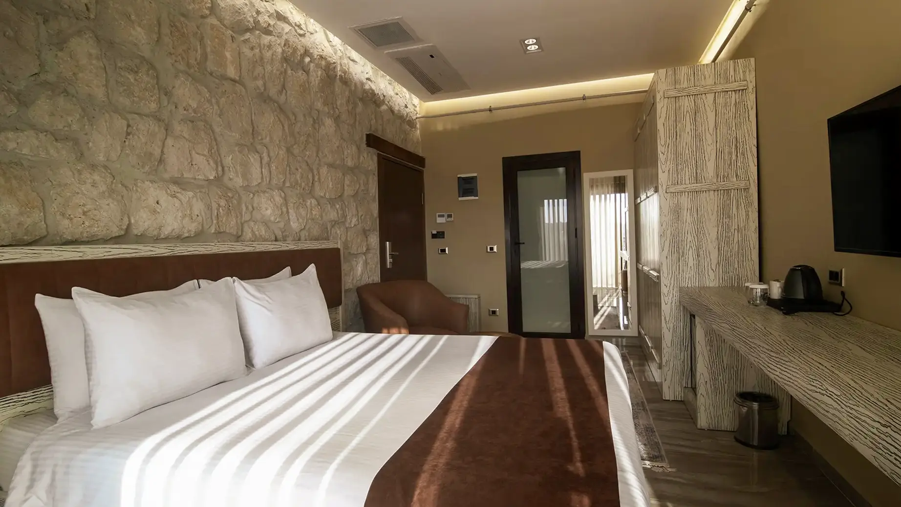 20 m² büyüklüğündeki Standart odamız, taş mimarinin nefes aldıran yapısıyla dizayn edilmiş olup, doğa manzaralı sade bir konaklama sunar. 1 adet French yatak ile 3 kişiye kadar konaklama kapasitesi bulunur.