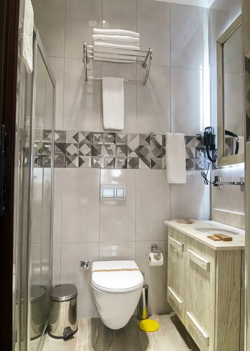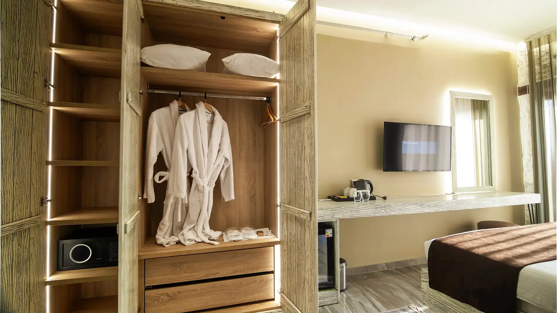 Modern duş sistemine sahip banyosu ve yalın tasarımı ile hem fonksiyonel hem de huzurlu bir ortam sağlar. Doğal dokular ve sade çizgilerle donatılan bu oda, doğanın huzurunu konforla buluşturan bir deneyim arayanlar için uygundur.